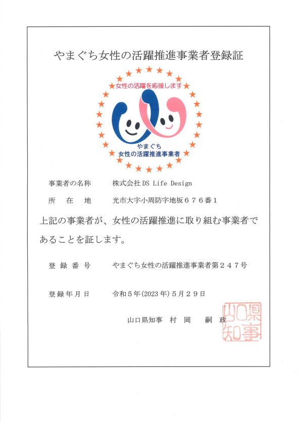 「やまぐち女性の活躍推進事業者」として認証されました。